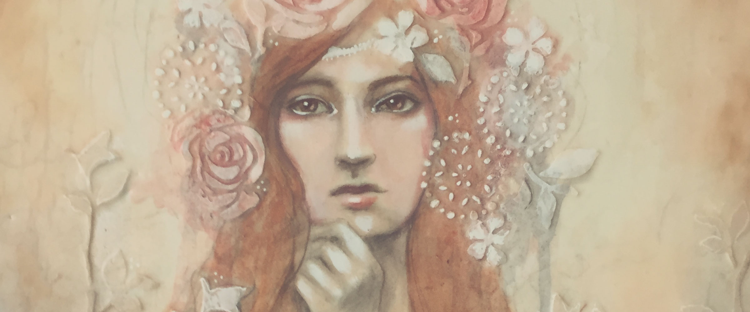 Create a heartfelt female figure using watercolor, pencil, and acrylic on plaster, enhanced by encaustic wax and poetic elements.
