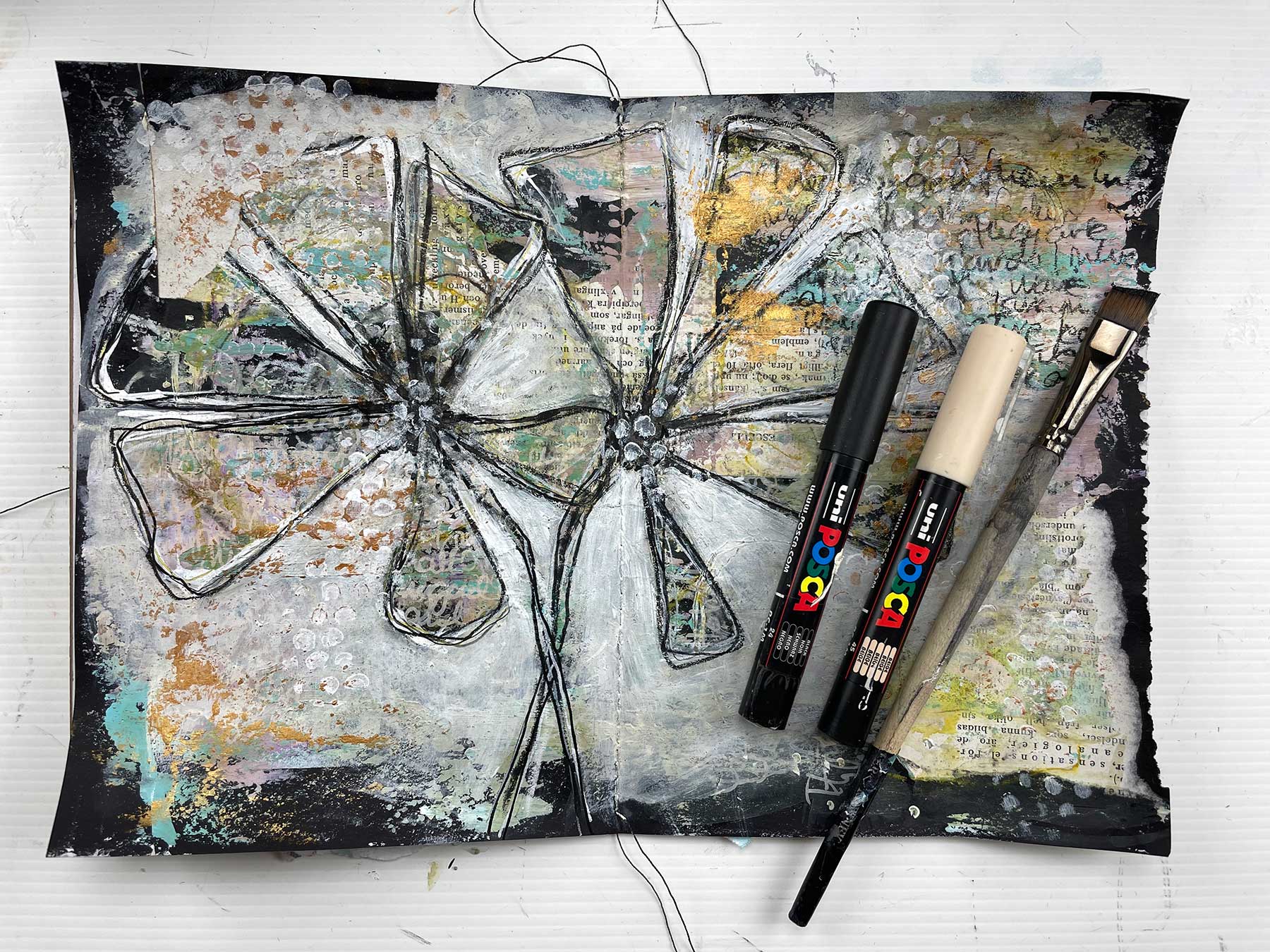 In this lesson I will show you my imperfect process of creating an imperfect piece of art. I am working in one of my handmade art journals and I am working on a black background. I will add collage and scrap paint and I will work with different kinds of marks and different materials to create grunge. I love muddy colors and imperfections. When I accepted the impossible, to achieve a perfect piece of art, something deeper, something that is unique, something that is essentially me starts to appear and take form. It is a process that makes me feel safe, that makes me feel at home, and when I stay in the imperfection, my art fills with meaning and soul.