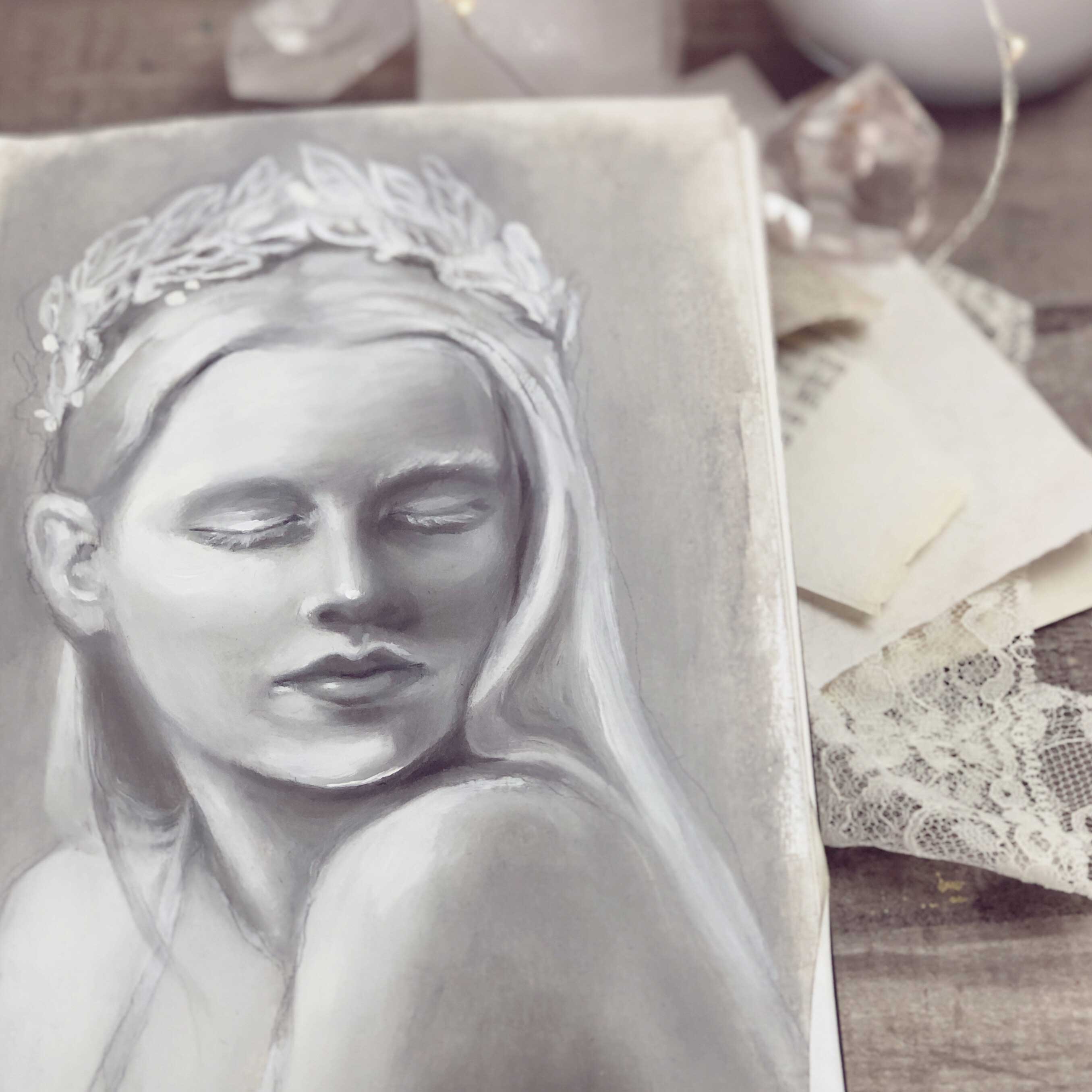 This meditative portrait is a wonderful creative balm where I simplify my materials, using only a few shades of white and grays. By doing this we can fully immerse ourselves in quiet, studious manifesting while we learn more about values and the beautiful forms of the face. I completed this lesson in oils but you are welcome to use the painting medium you enjoy the most.