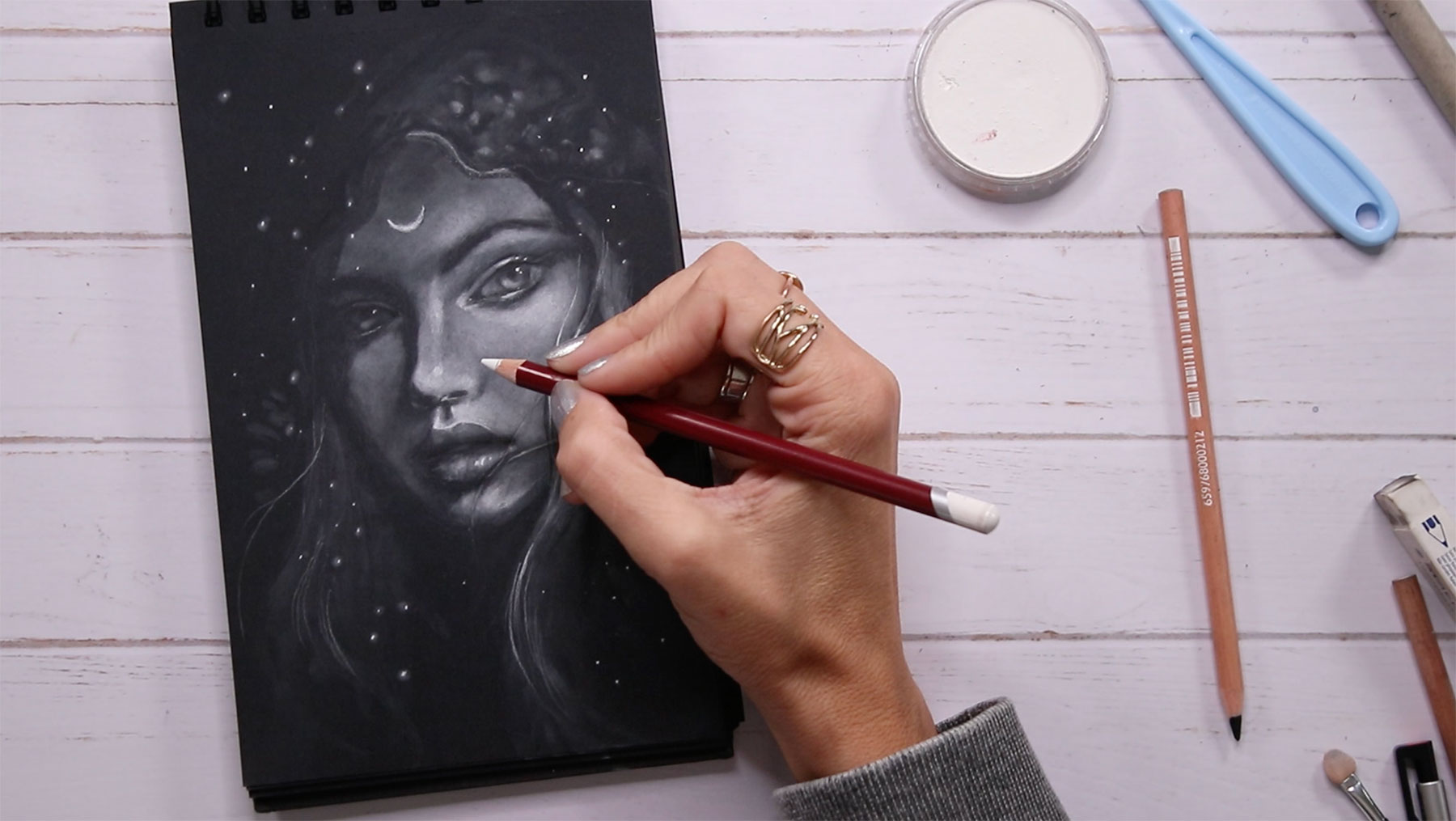 I’m delighted to share this fun witchy lesson with you for our month focused on this mystical time of year with Halloween and Samhain as our inspiration! I wanted the materials to be very limited and it was such a great challenge to work on switch things up and work on black paper!